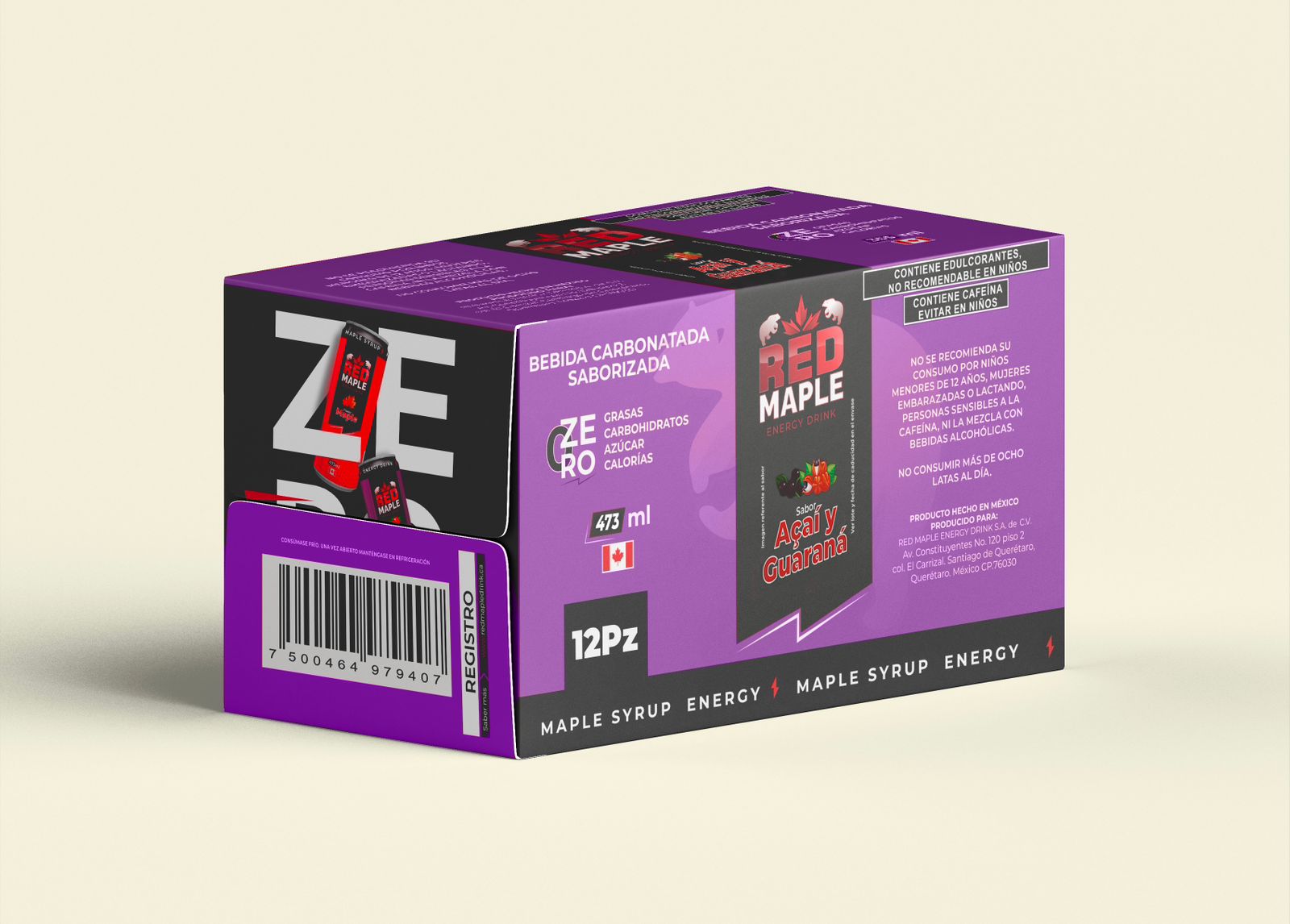 Una caja de Maple rojo sabor Açai y guaraná con 12 unidades de 473 ml